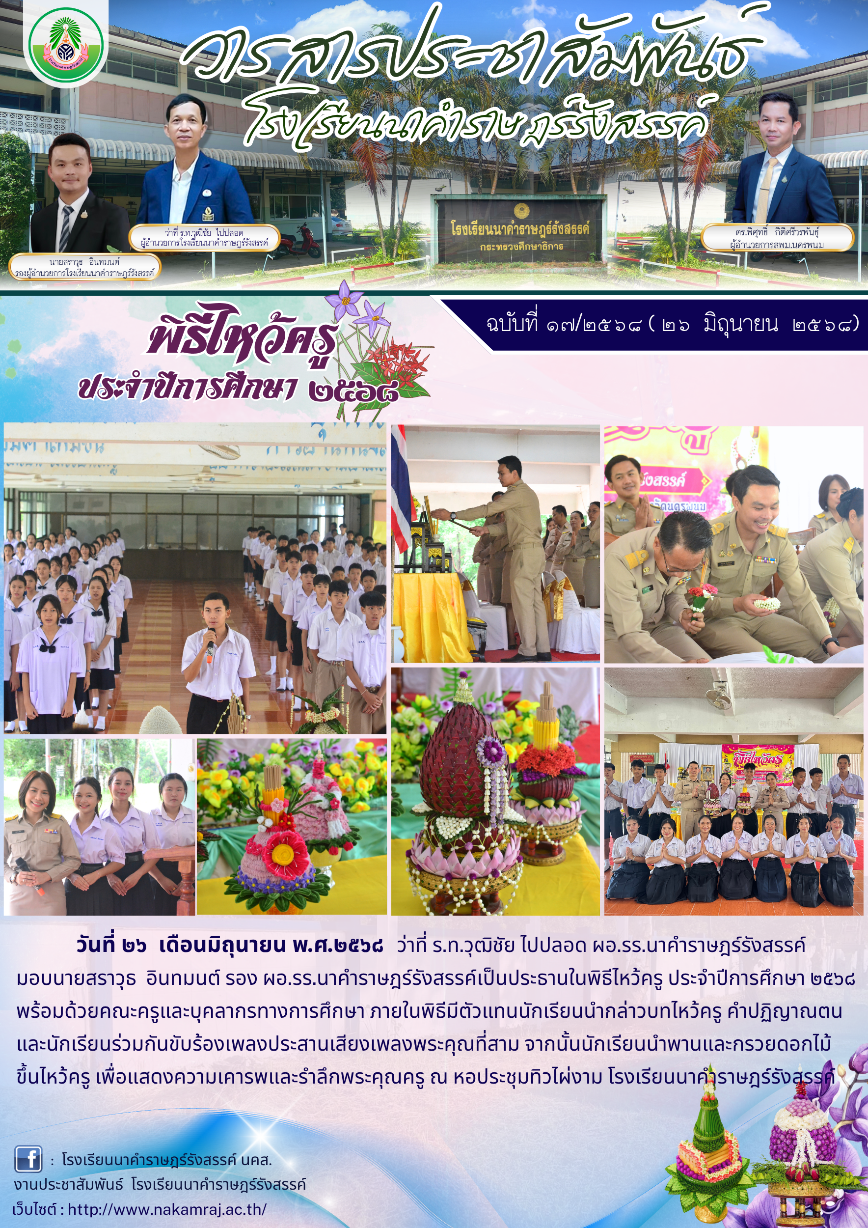- วารสารประชาสัมพันธ์ ฉบับที่ 17/2568 วันที่ 26 มิถุนายน 2568 : กิจกรรมพิธีไหว้ครู ประจำปีการศึกษา 2568