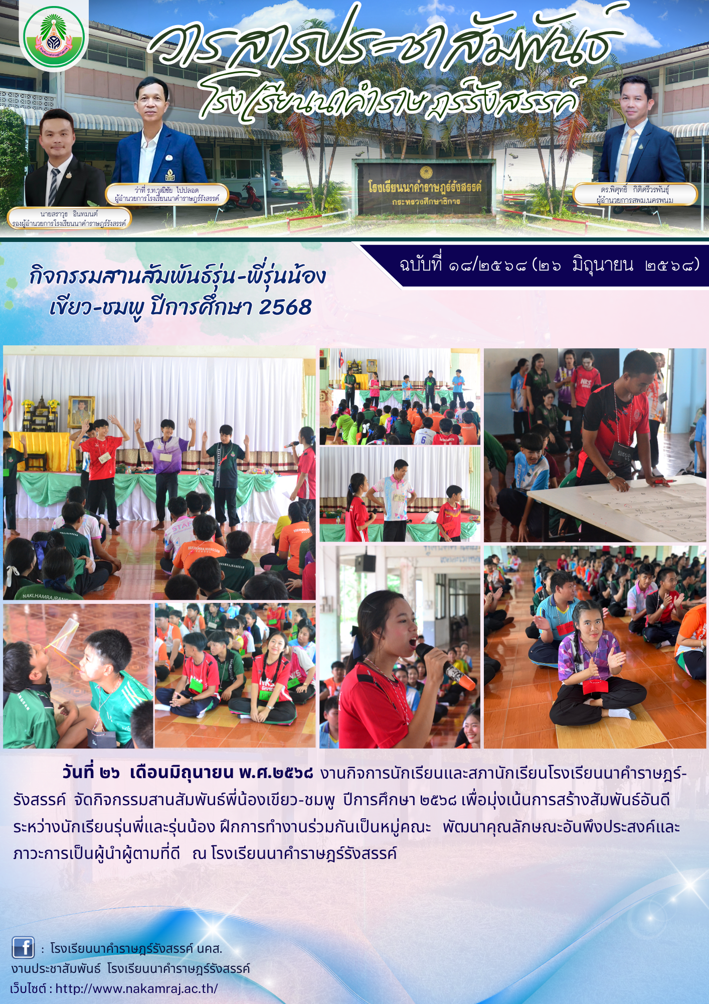 - วารสารประชาสัมพันธ์ ฉบับที่ 18/2568 วันที่ 26 มิถุนายน 2568 : งานกิจการนักเรียนและสภานักเรียนโรงเรียนนาคำราษฎร์รังสรรค์ จัดกิจกรรมสานสัมพันธ์พี่น้องเขียว-ชมพู ปีการศึกษา 2568