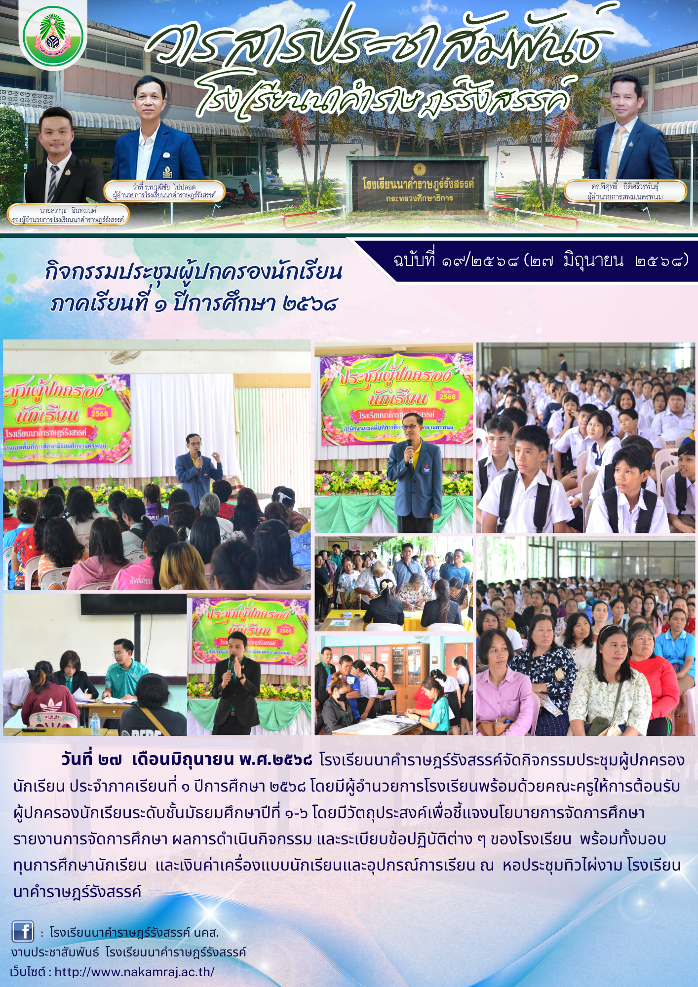 - วารสารประชาสัมพันธ์ ฉบับที่ 19/2568 วันที่ 27 มิถุนายน 2568 : กิจกรรมประชุมผู้ปกครองนักเรียน ประจำภาคเรียนที่ 1 ปีการศึกษา 2568 พร้อมทั้งมอบทุนการศึกษาแก่นักเรียน และจ่ายเงินค่าเครื่องแบบนักเรียนและอุปกรณ์การเรียน