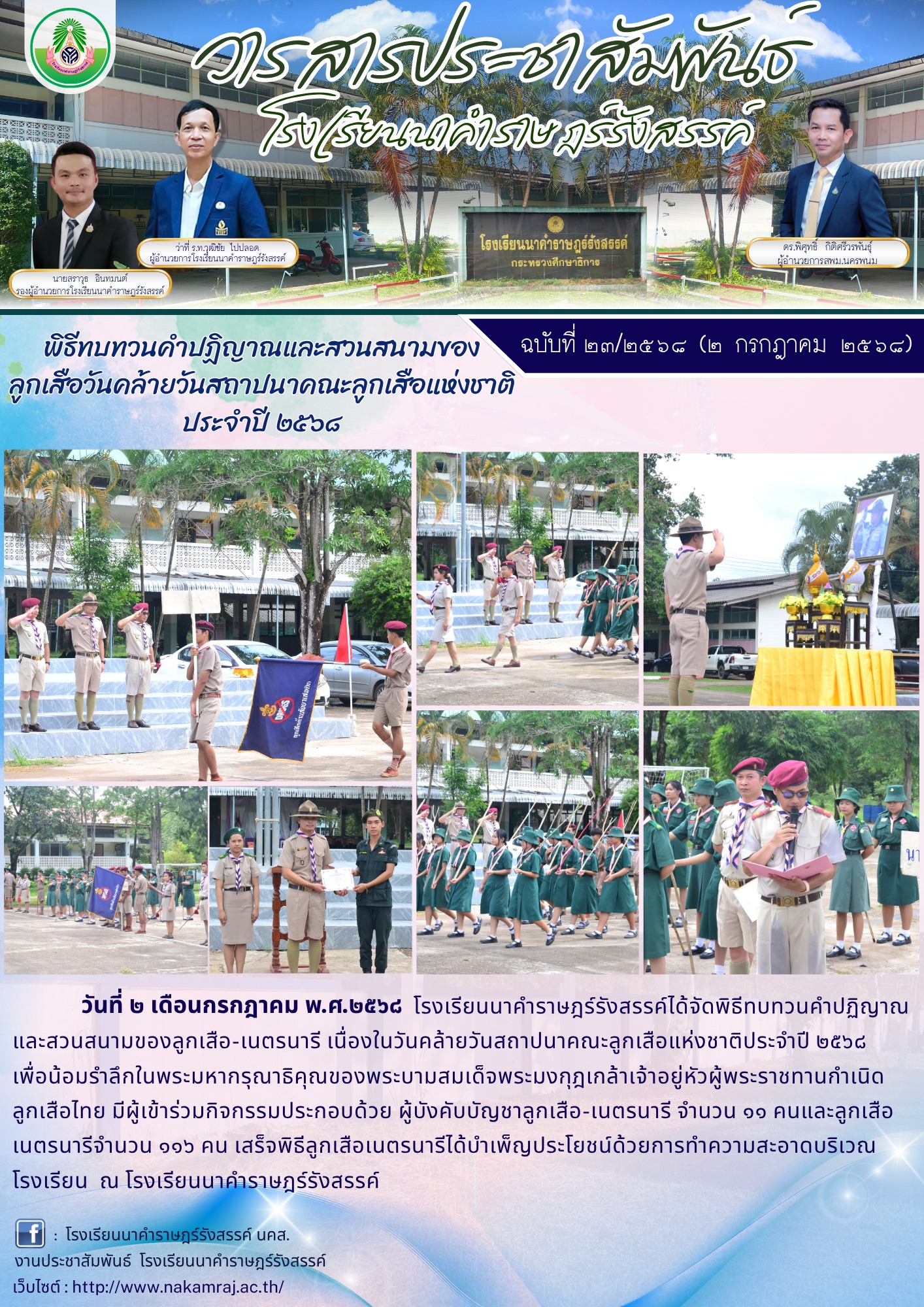 - วารสารประชาสัมพันธ์ ฉบับที่ 23/2568 วันที่ 2 กรกฎาคม 2568 : พิธีทบทวนคำปฏิญาณและสวนสนามของลูกเสือ-เนตรนารี เนื่องในวันคล้ายวันสถาปนาคณะลูกเสือแห่งชาติ ประจำปี 2568