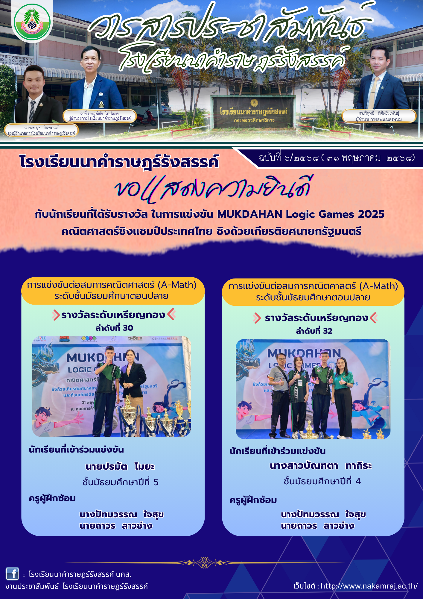 - วารสารประชาสัมพันธ์ ฉบับที่ 6/2568 วันที่ 31 พฤษภาคม 2568 : ขอแสดงความยินดีกับนักเรียนที่ได้รับรางวัล ในการแข่งขัน MUKDAHAN Logic Gamems 2025 คณิตศาสตร์ชิงแชมป์ประเทศไทย ชิงถ้วยเกียรติยศนายกรัฐมนตรี