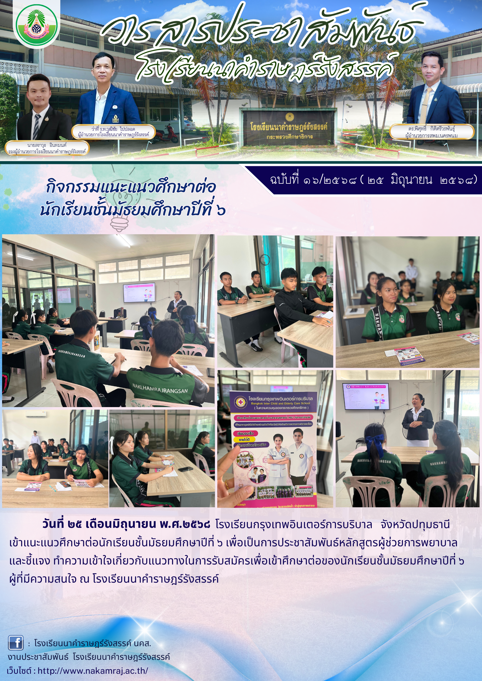 - วารสารประชาสัมพันธ์ ฉบับที่ 16/2568 วันที่ 25 มิถุนายน 2568 : โรงเรียนกรุงเทพอินเตอร์การบริบาล จังหวัดปทุมธานี ีเข้าแนะแนวศึกษาต่อนักเรียนชั้นมัธยมศึกษาปีที่ 6