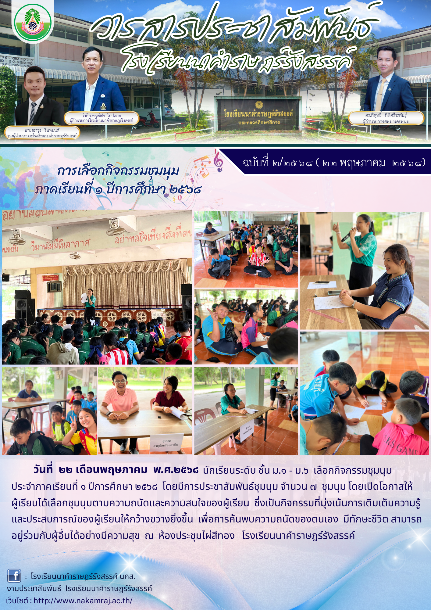 - วารสารประชาสัมพันธ์ ฉบับที่ 2/2568 วันที่ 22 พฤษภาคม 2568 : การเลือกกิจกรรมชุมนุม ภาคเรียนที่ 1 ปีการศึกษา 2568