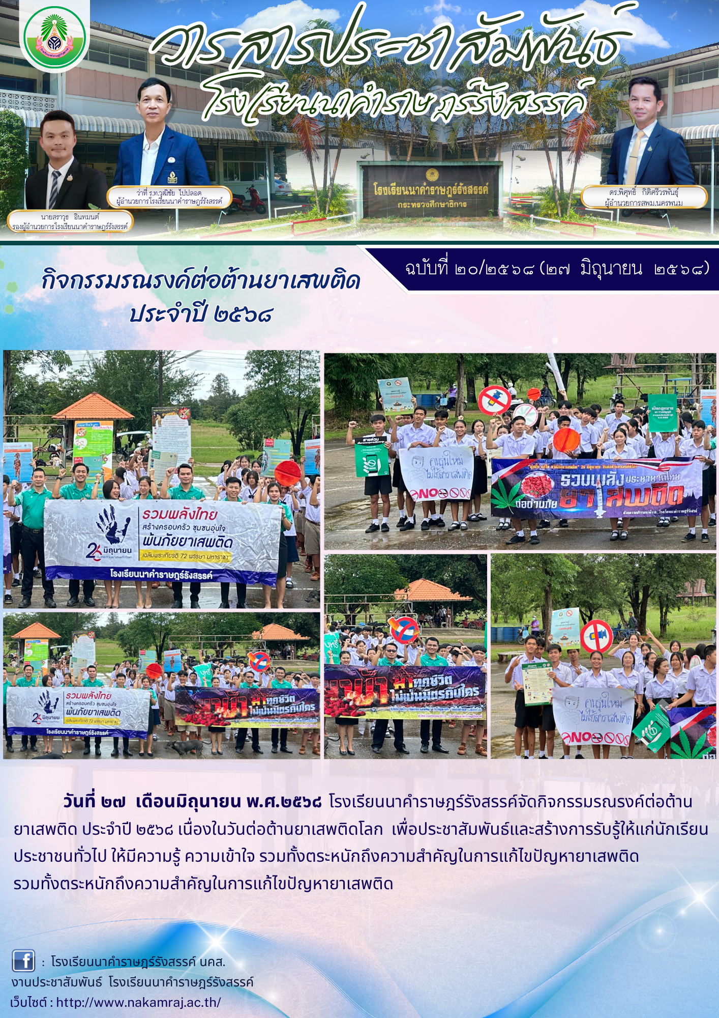- วารสารประชาสัมพันธ์ ฉบับที่ 20/2568 วันที่ 27 มิถุนายน 2568 : กิจกรรมรณรงค์ต่อต้านยาเสพติด ประจำปี 2568 เนื่องในวันต่อต้านยาเสพติดโลก
