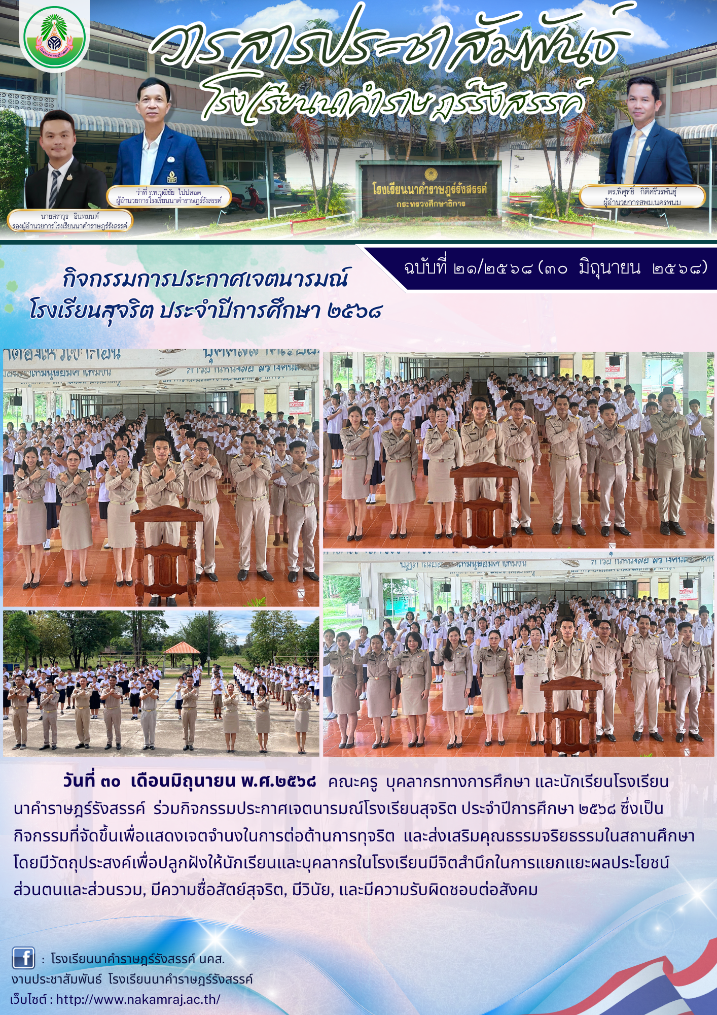 - วารสารประชาสัมพันธ์ ฉบับที่ 21/2568 วันที่ 30 มิถุนายน 2568 : กิจกรรมประกาศเจตนารมณ์โรงเรียนสุจริต ประจำปีการศึกษา 2568