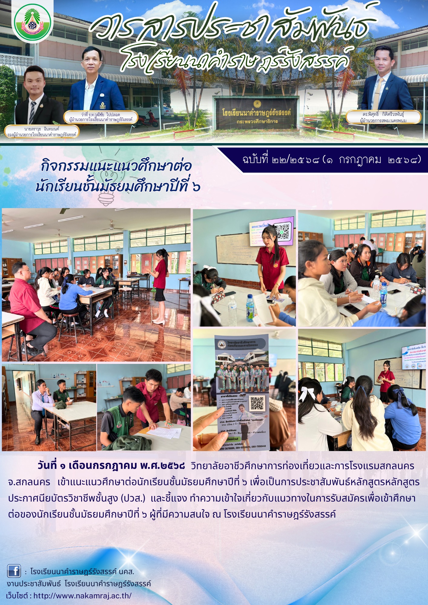 - วารสารประชาสัมพันธ์ ฉบับที่ 22/2568 วันที่ 1 กรกฎาคม 2568 : วิทยาลัยอาชีวศึกษาการท่องเที่ยวและการโรงแรมสกลนคร จ.สกลนคร เข้าแนะแนวศึกษาต่อนักเรียนชั้นมัธยมศึกษาปีที่ 6