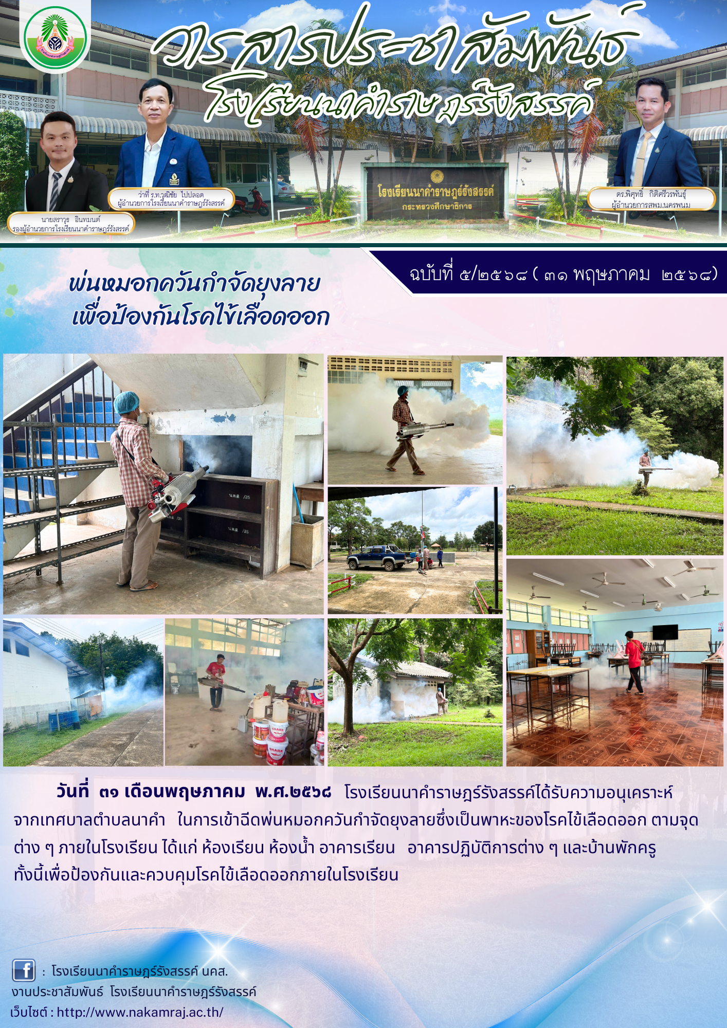 - วารสารประชาสัมพันธ์ ฉบับที่ 5/2568 วันที่ 31 พฤษภาคม 2568 : พ่นหมอกควันกำจัดยุงลายเพื่อป้องกันโรคไข้เลือดออก